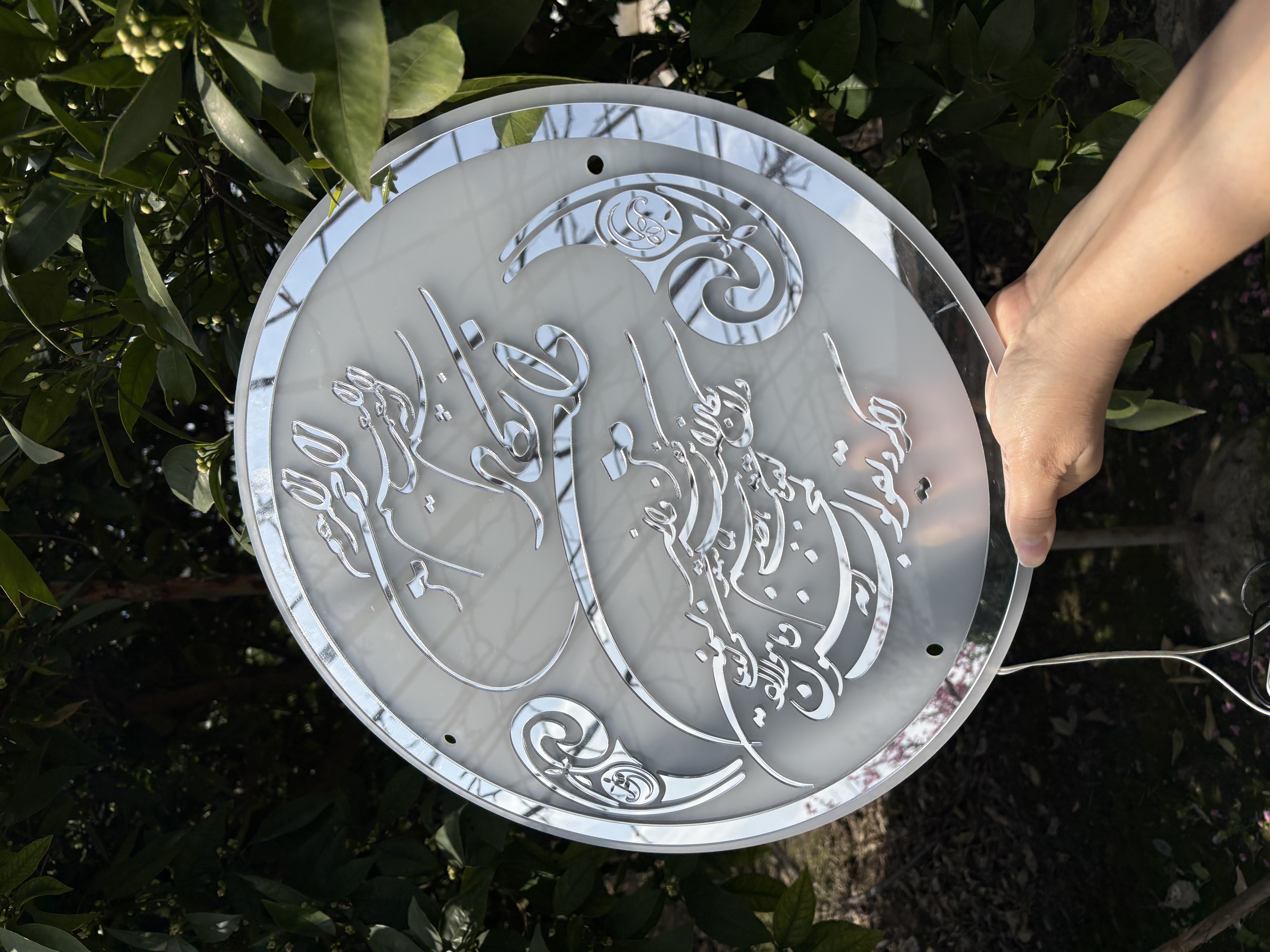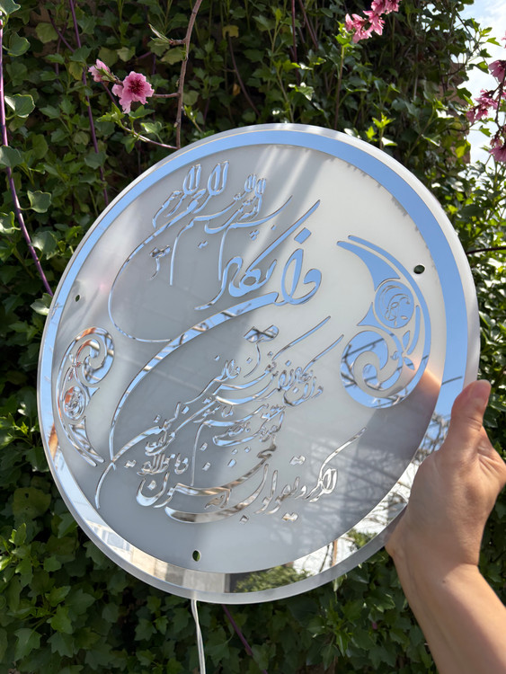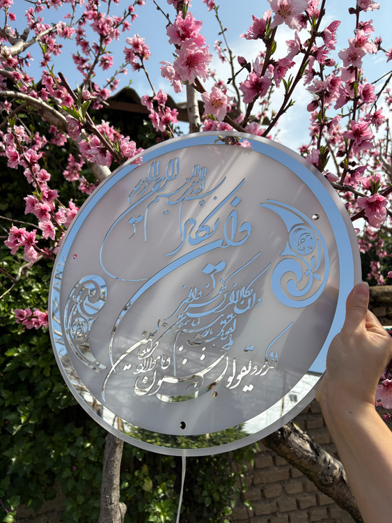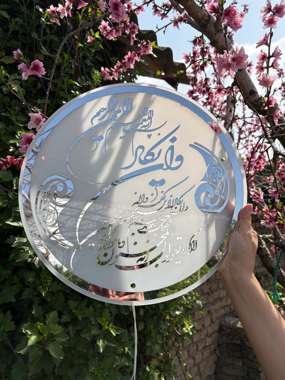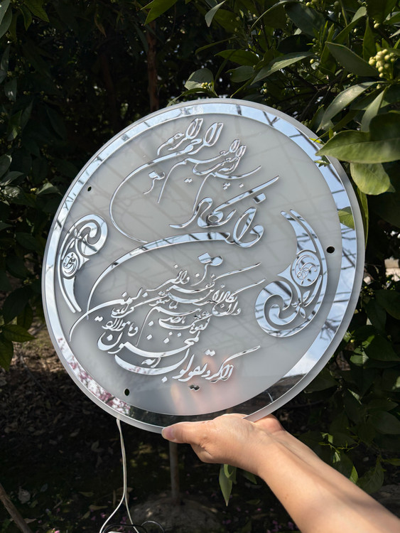 تابلو پیش رو یکی از کارهای چشم نواز و پرفروش گالری لی لی فر است ؛ یک اثر ۴۰ سانتی از جنس پلکسی آینه ای با نورپردازی بک لایت که با دقت بالا و تکنیک برش لیزری ظریف ساخته شده ؛ این محصول ترکیبی از زیبایی بصری ، نورپردازی مدرن و هنر خوشنویسی است که آن را به یک دکور منحصر به فرد برای هر فضایی تبدیل میکند .